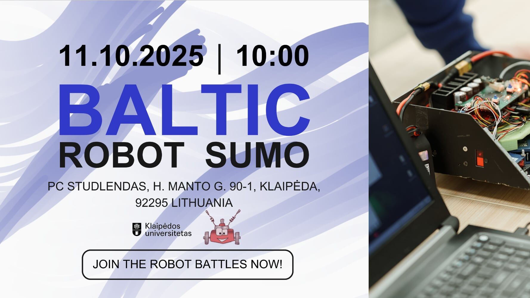 Klaipėdos Universiteto Aula Magna (PC Studlendas) H. Manto gatvė 90, Klaipėda, LithuaniaHello, robotics lovers! We are announcing robotics competition “Baltic Robot Sumo Championship 2025”! When? October 11th 10 am. Where? Klaipeda University Aula Magna (PC Studlendas, H. Manto g. 90-1, Klaipėda, 92295) What will be held? Categories: Antweight 200 g; Antweight 454 g; Mini Sumo; 3 kg Sumo. Rules: https://kurc.lt/taisykles/